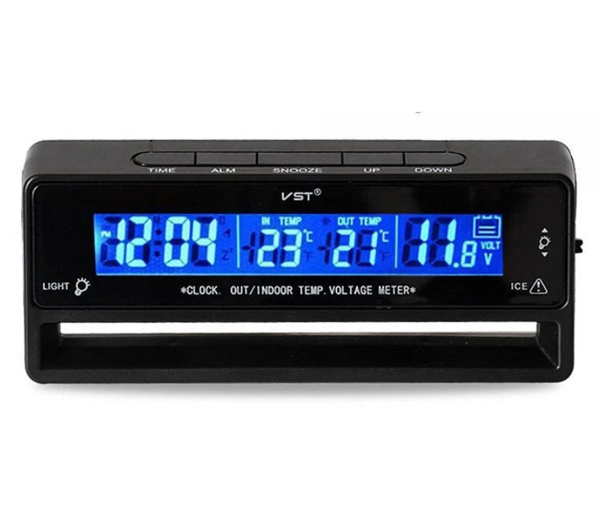 Характеристики: Відображення: Дата, час (12 і 24 годинний режим) і день неділі. Будильник. Функція SNOOZE (соня) з тривалістю 5 хв. Датчик внутрішньої та зовнішньої температури (Цельсій, Фаренгейт). Термометр оновлює дані через каждые 20 сек. Двухцветная LED підсвітка (зелена і синя). При підключенні до мережі електропитання автомобіля індикатор працює в повному обсязі, якщо апарат працює від батарейки, то індикатор працює в економному режимі і показує тільки час. Вбудований вольтметр (відображає заряд акумулятора з точністю до десяти вольт). Робоча напруга: 12.0V. Длинна провода датчика зовнішньої температури 3м. Розміри: 13х5х4,8 см.