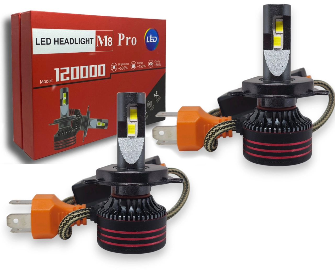 Характеристики: ризначення: заміна штатних ламп Цоколь: H4 Модель: M8 PRO Тип світлодіодного елемента: Seoul-CSP Температура світла: 6000К Робоча напруга: 9-24V Світловий потік: 60000Lm Потужність: 120W Особливості: з обманкою