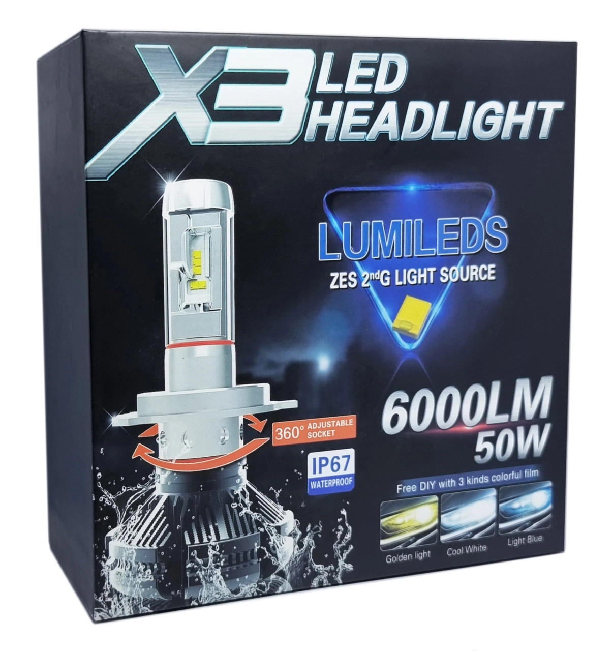 Світлодіодні лампи Х3 — це лампи нового покоління на базі оригінальних чипів Philips Lumileds ZES (не плутайте з бюджетним аналог моделі Х3), які дають на 70% більше світла, ніж галогенна лампа. Призначені для заміни ламп у фарах головного світла та протитуманних фарах. У цій моделі дотримані всі стандарти для встановлення в посадкове місце фари, витриманий фокус і світло-тенева межа світіння. Обладнані обманкою для обода контролю системи згорілої лампи. Характеристики: Призначення: заміна штатних ламп головного світла автомобіля Цоколь: H4 Модель: X3 Тип світлодіодного елемента: Philips Lumileds ZES Кількість світлодіодів: 10 pcs Система охолодження: IP65 Температура світіння: 3000К/6500K/8000K Світловий потік: 6000 Lm Термін служби: від 30000 годин Кут пучка світіння: 360 Робоча температура: від -40 до 80