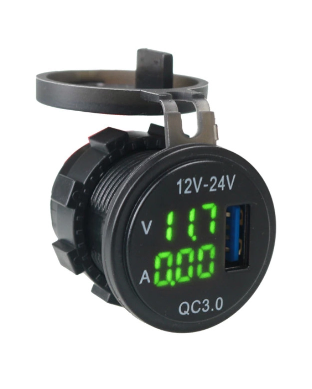 Автомобільний зарядний пристрій 1порт USB 12-24V врізна розетка, Вольтметр + амперметр зелене підсвічування