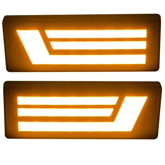 Характеристика: Призначення: Світлодіодні, бічні, габаритні ліхтарі Колір світіння: Жовтий Комплектація: 2 ліхтарі та 2 накладки Напруга: 12 В Розміри: 11*4см