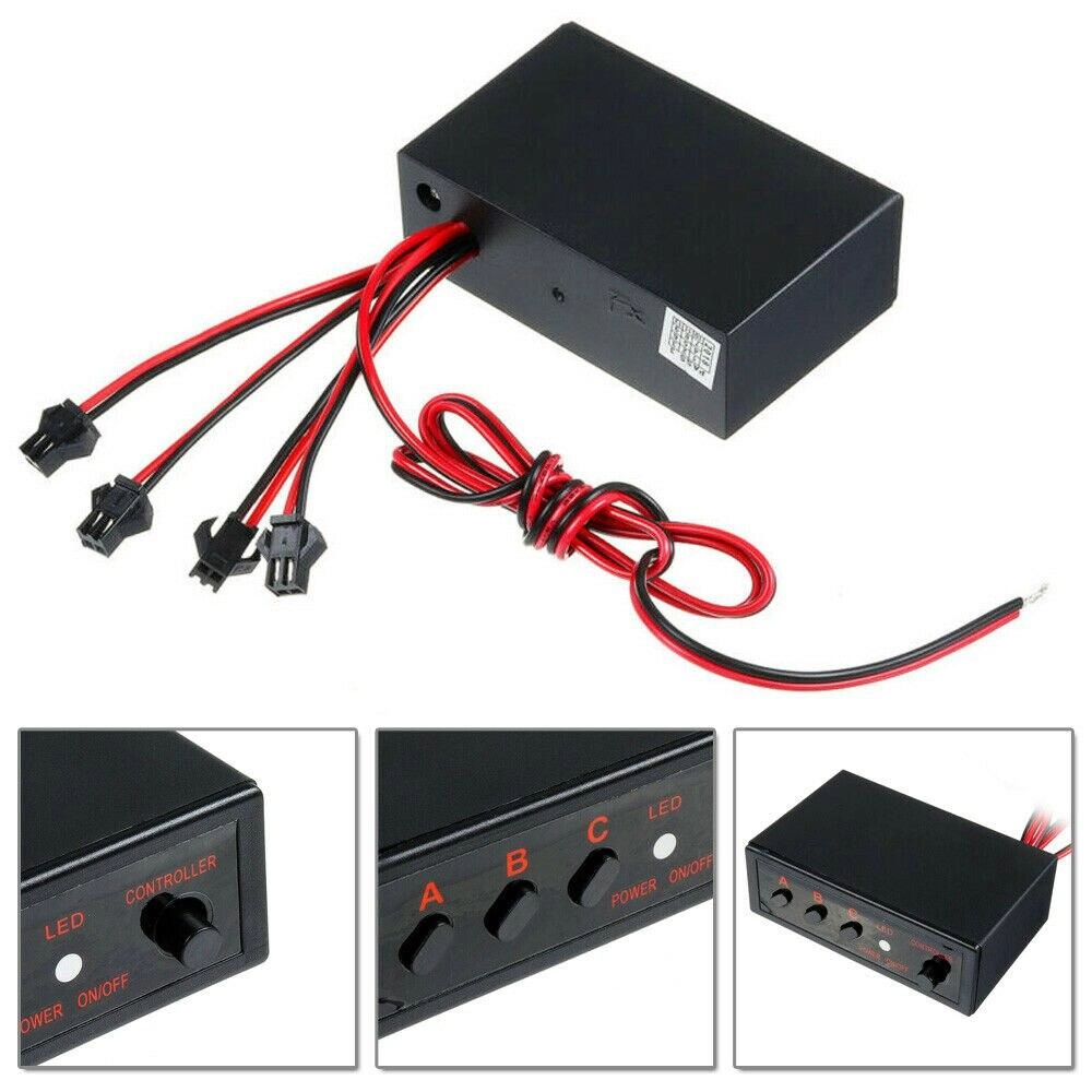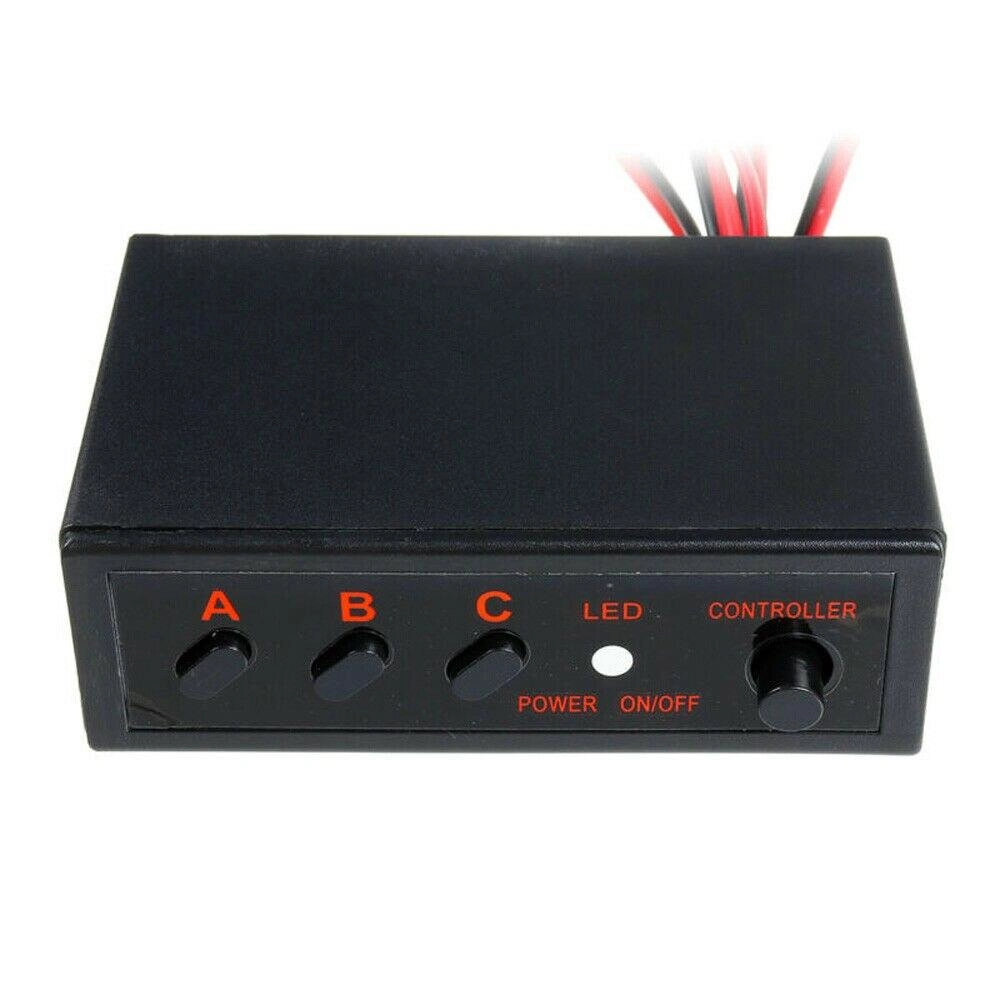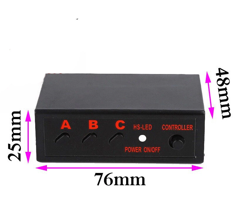 До кожного каналу можна підключити окрему світлодіодну стрічку, лінійку, лампочку, панель, стробоскоп, блок денних ходових вогнів і т.д. Технічні характеристики: Матеріал: пластик Напруга: DC 12V Розмір:76*25*48мм Режими: Кількість режимів: 3 (включаються кнопками A, B, C) Кнопка А: Моргають 2 лампи одночасно. Кнопка В: Миготять 2 лампи по черзі. Кнопка С: Режим стробоскопа-лампи мерехтять по черзі. Підключення: Оголені кінці проводів приєднайте до плюсу та мінусу автомобіля (червоний – плюс, чорний – мінус) До кожного із чорних роз’ємів підключіть світлодіодну стрічку, лінійку, лампочку, панель, стробоскоп, блок денних ходових вогнів увімкніть модуль керування і натисніть A, B або C