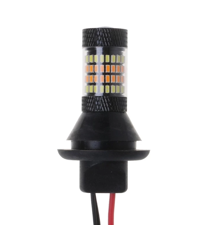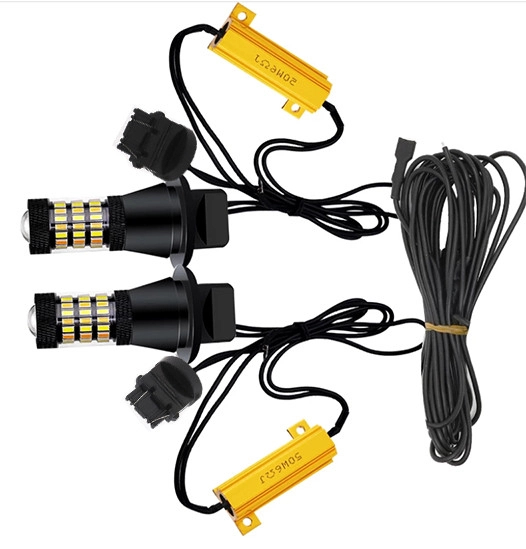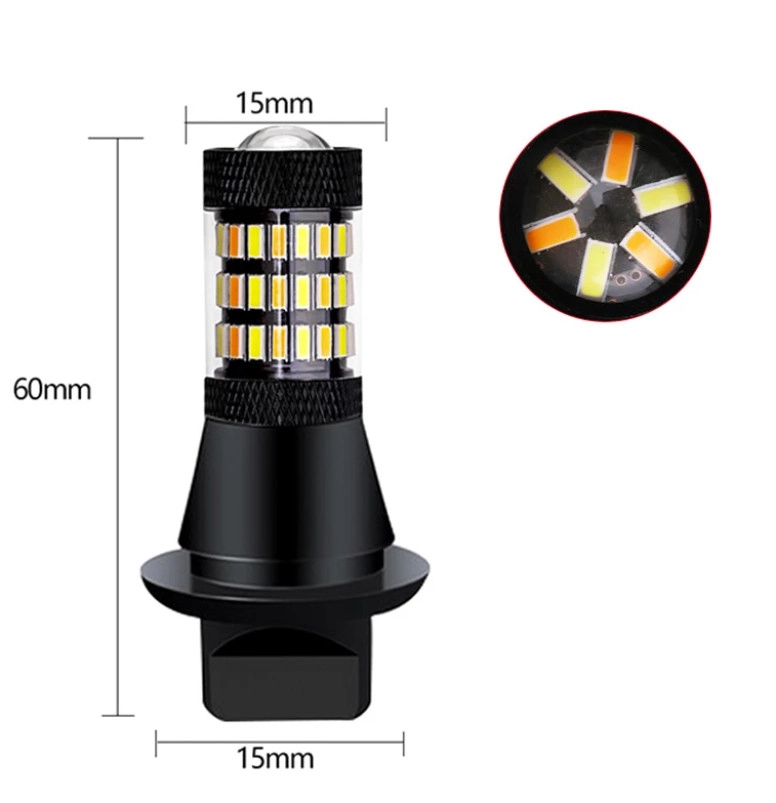 Дневной ходовой огонь (ДХО) с функцией поворотов; для установки на автомобили с CANBUS(обход индикации ошибки бортовым компьютером или устранения частого мерцания лампы поворотов) Возможна установка как дополнительный задний ход в фанарях поворотника при условии прозрачного стекла. Характеристика: Тип цоколя: 3157; Рабочий диапазон напряжения: 10,8 – 14,4 В; Угол свечения: 360 град; Количество светодиодных элементов – 60 шт.; Тип светодиодных элементов- 4014; Цвет свечения: -белый + желтый; Робочий діапазон температур: -30С до +85С; світловий потік – 900 Люмен; Комплектація: 2 лампи і 2 резистора і комплект проводки підключення