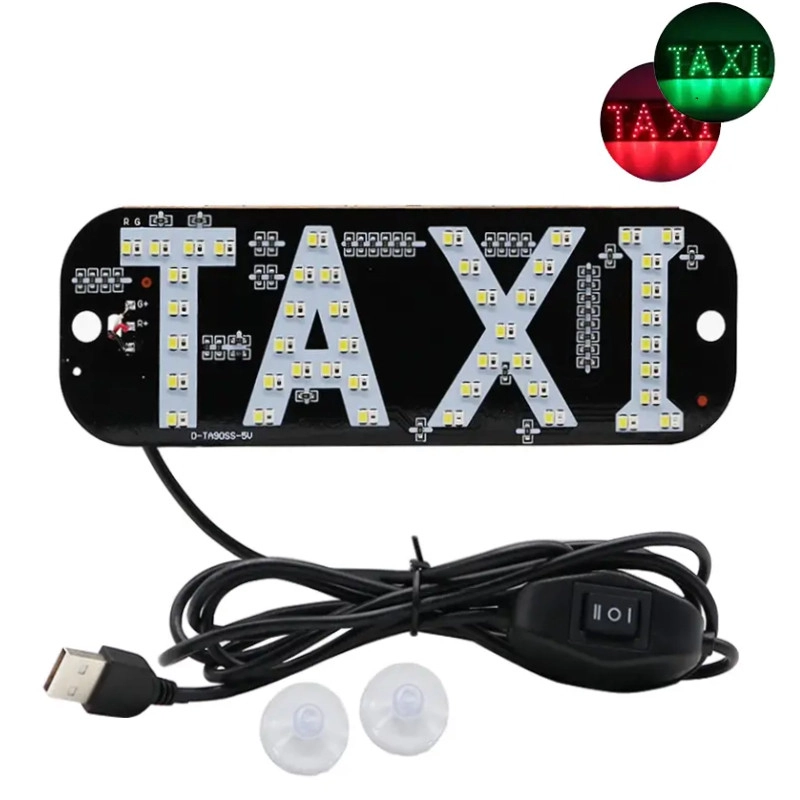 Табличка слугує для позначення автомобіля таксі. Особливо корисна буде в темну пору доби, оскільки напис “TAXI” буде помітний здалеку. Табличка являє собою друковану плату з розміщеними на ній SMD компонентами: резисторами та світлодіодами. Як джерела світла використовуються світлодіоди зеленого кольору світіння в корпусі SMD. За допомогою присосків табличка кріпиться до лобового скла автомобіля всередині салону. Встановлюється на стекло автомобіля при допомоги присосок. Під’єднується через штекер в прикурювач в автомобіля. Характеристика: Колір світіння: Зелений, Червоний, Робоча напруга: 12 В; Кількість світлодіодів: 90 шт; Габарити таблички: 190 мм х 63 мм Живлення: від USB