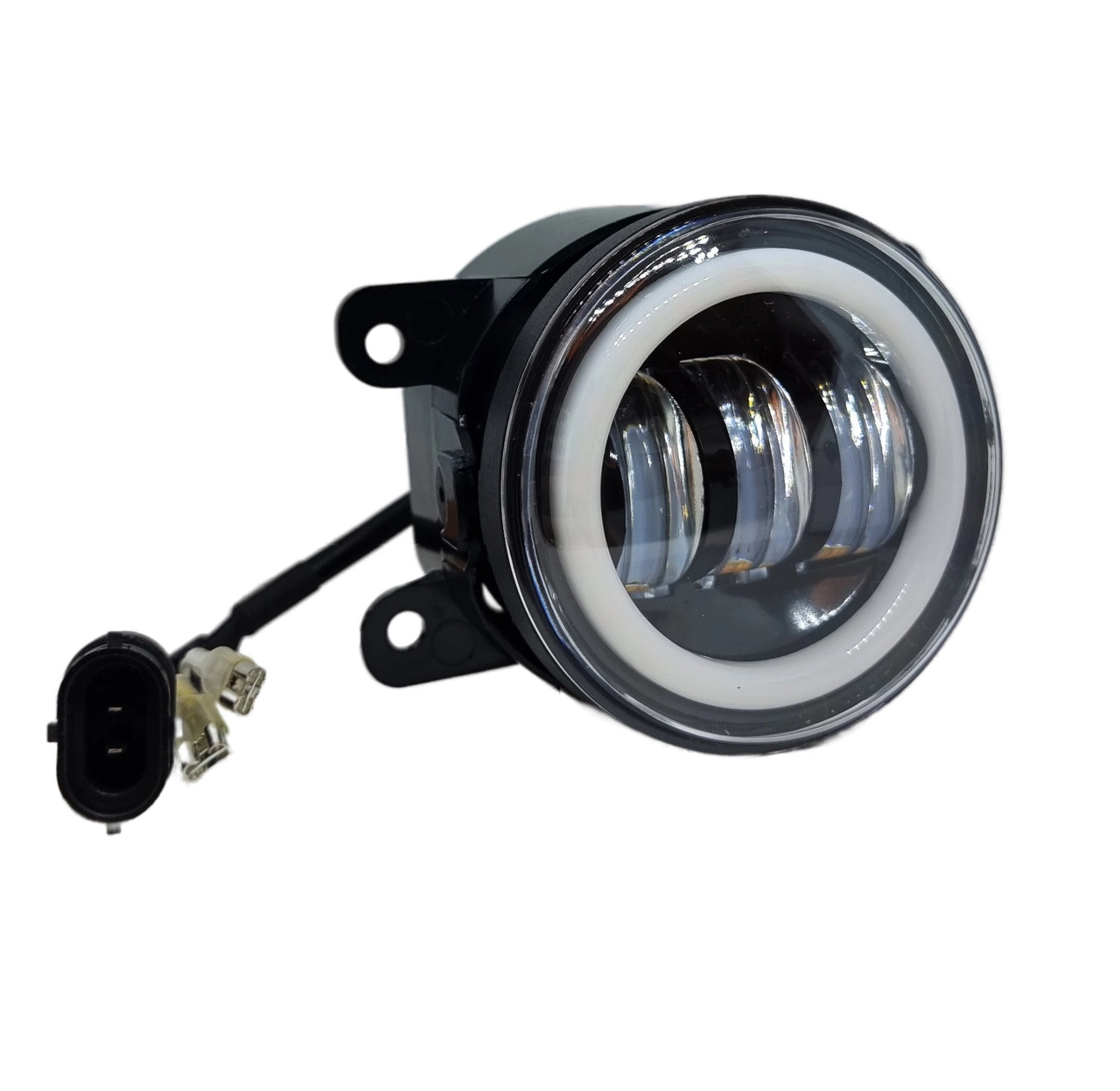 Протитуманні фари з чіткою СТГ. За рахунок лінз дуже добре освітлює. Потужні штатні світлодіодні лінзовані LED протитуманні фари в бампер рекомендовані для автомобілів: OPEL, PEUGEOT, RENAULT, FORD Фари мають чіткий світло-тіньовий кордон і не сліплять зустрічних водіїв, що дозволяє використовувати їх на додаток до ближнього світла і як протитуманні фари. Led фара не боїться вібрацій, пило- та водонепроникна, ударостійка, клас захисту IP67. За допомогою кріплення, що йде в комплекті, Ви зможете надійно закріпити та відрегулювати фару. Характеристики: Потужність: 30W Кількість світлодіодів: 3 Розміри: Діаметр 90 мм Колірна температура: 6000К Матеріал: Литий алюміній та пластик Робочий діапазон напруги: 10 – 30V Особливості: Режим габарит та поворот. Ангельські очі світяться білим і жовтим. Основне світло забезпечується трьома лінзами, які також світять білим або жовтим.