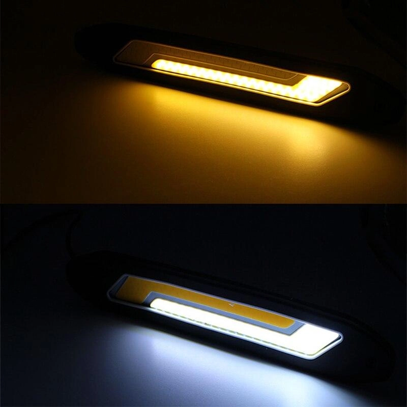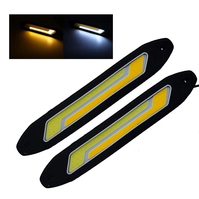 Характеристики: Тип діода: COB Колір світіння: Білий/Жовтий Довжина: 26см Ширина: 4,3 см Напруга: 12V Колірна температура: 6000К Тип матеріалу: силікон Призначення: Для денних ходових вогнів, протитуманних ліхтарів, гальмівних вогнів, задніх ліхтарів, декоративних вогнів, номереых знаків та інше. Легко встановити на будь-якому транспортному засобі.