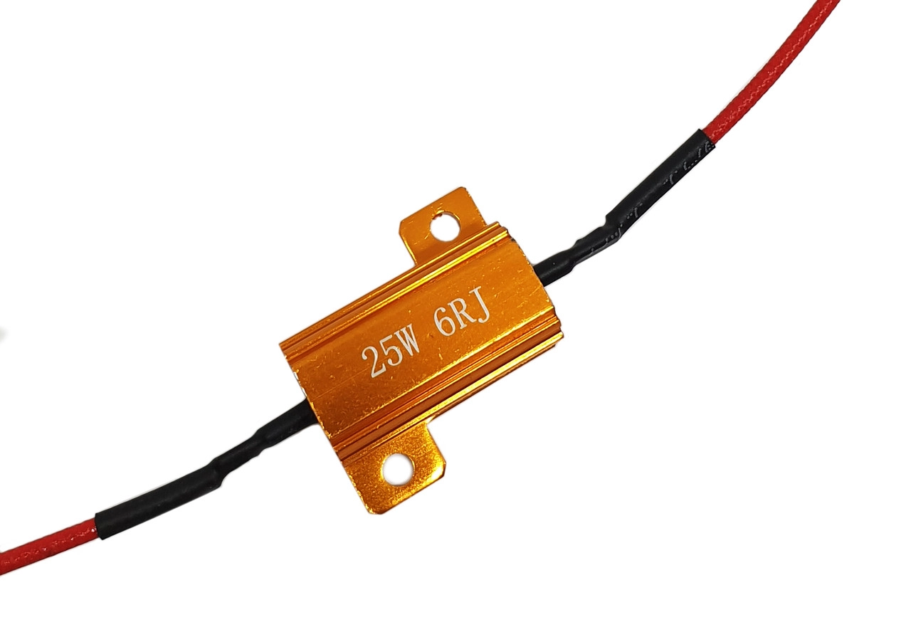 Навантажувальні опору, резистори, обманки для винятку помилок на приладовій панелі під час встановлення світлодіодних LED ламп, ксенону тощо. на сучасні автомобілі обладнані системою відстеження перегоряння ламп. Ціна вказана за одну обманку з двома затискачами. Якщо ви зіткнулися з тим, що під час встановлення не рідних ламп (LED, ксенон), на Ваш автомобіль, на панелі приладів показує помилку, через перегоряння ламп, лампи моргають або взагалі не вмикаються, тоді вам будуть потрібні навантажувальні гумки-обманки. Обманки змусять комп’ютер автомобіля думати, що до нього під’єднані стандартні галогенові лампи. Також ці обманки можна використовувати під час встановлення світлодіодних LED ламп у поворотники, для усунення частого моргання поворотників. Характеристики: Опір — 6 Ом Потужність 25 ватів Напруга живлення 12 вольтів (для встановлення на 24 вольти потрібно послідовне під’єднання двох обманів) Розміри:26x22x17 Керамічний резистор в алюмінієвому герметичному корпусі-радіаторі, з припаяними проводами в ганчірочній ізоляції, не схильній до плавлення, з чотирма швидкознімними затискачами, для швидкого й акуратного встановлення.
