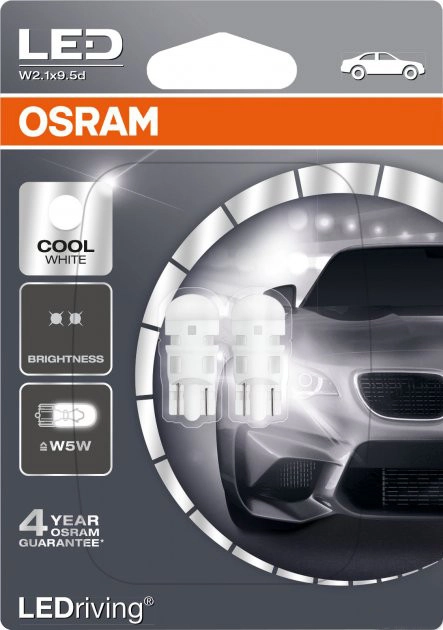Характеристики: Виробник: Osram Цоколь: W5W Модель: 2880CW-02B Країна виробник: Німеччина Потужність: 1W Тип запчастини: оригінальна Напруга: 12B Упаковка: Blister (2 лампи)