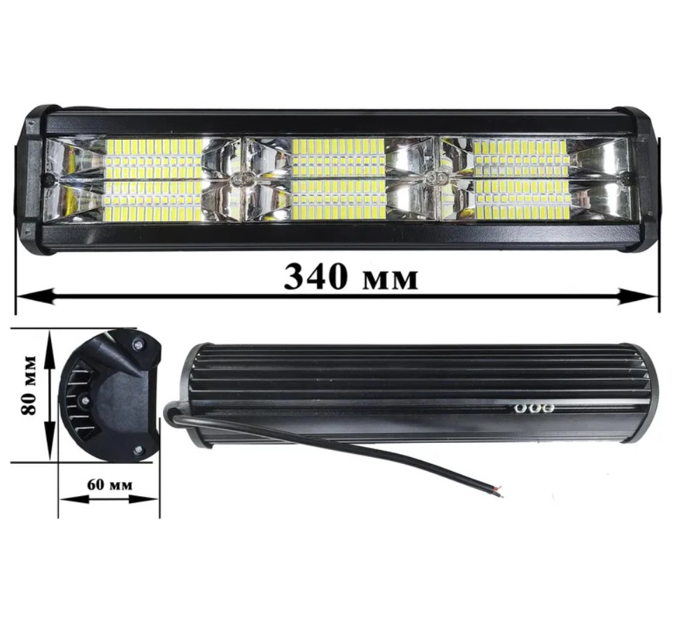 Характеристики: Вид: додаткові фари Кількість діодів:72 Напруга живлення: 12V-24V Потужність фари: 120 Ватт Температура світла: 6000К Яскравість однієї фари 10000 Lm Ступінь вологозахисту: IP 67 Матеріал корпусу: Литий алюміній Розмір Д*Ш*В: 340*80*60 мм Ціна вказана на 1 шт.