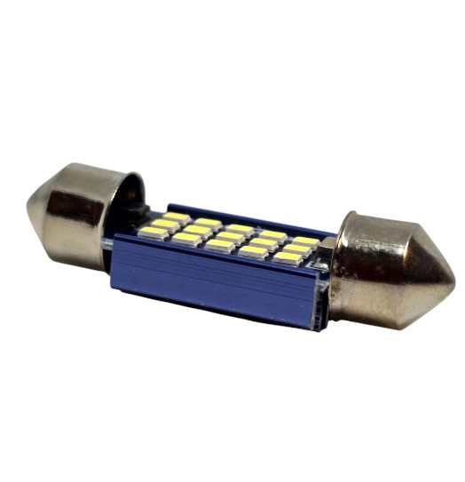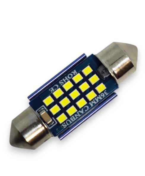 Цоколь: C5W Festoon Тип діода: 2016 Кількість діодів: 15 Колір світіння: Білий Світловий потік: 400Lm Напруга живлення: 12V Температура світла: 6000K Потужність: 1,8W Розмір: 36*12мм Особливості: з обманкою і радіатором (не боїться перепадів напруги)