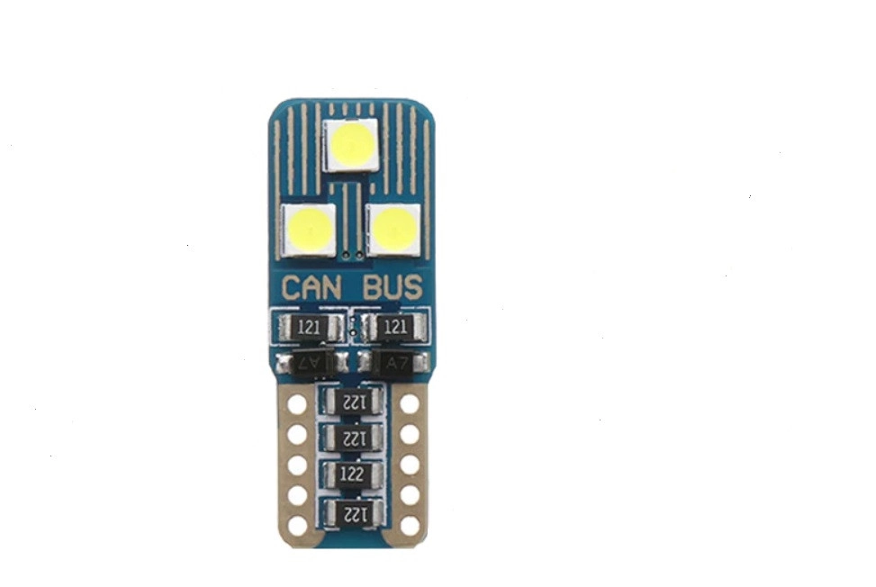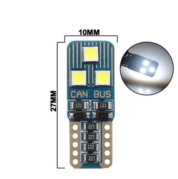 Характеристика: Цоколь: Т10 (W5W) Тип светодиода: 3030 Количество диодов: 6 Цвет свечения: Белый Напряжение питания: 12V Световой поток: 200Лм