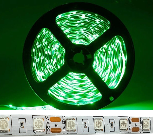 Характеристика: Довжина: 5 метрів Тип діода: 5050 Кількість світлодіодів: 60 SMD на метр Потужність: 14,4W / M Напруга: 24V Колір світіння: Зеленый Особливості: на двосторонньому скотчі