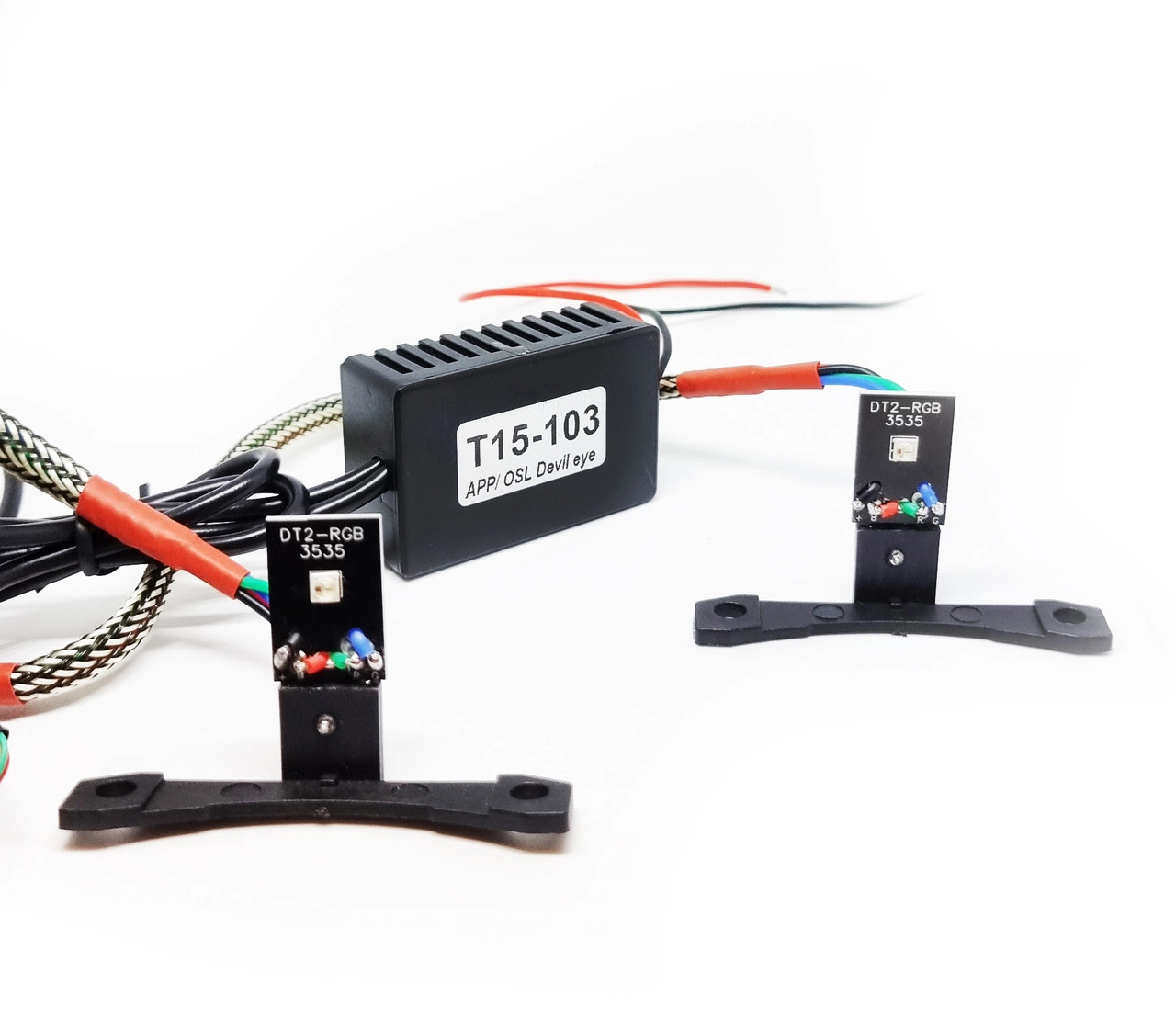 Очі диявола – це один із типів підсвічування, для біксенонових лінз G5. Це внутрішнє, світлодіодне підсвічування лінзи. LED кристал спрямований всередину лінзи, а саме світить відбивач білінзи. Такий тип підсвічування зробить вигляд будь-якого автомобіля стильним. Сумісність з біксеноновими лінзами будь-яких виробників. Характеристика: Колір: RGB 7 кольорів Потужність – 3 Вт Харчування – 9-16В Чіп – cree Матеріал основи – пластик/алюміній. Комплект 2шт.