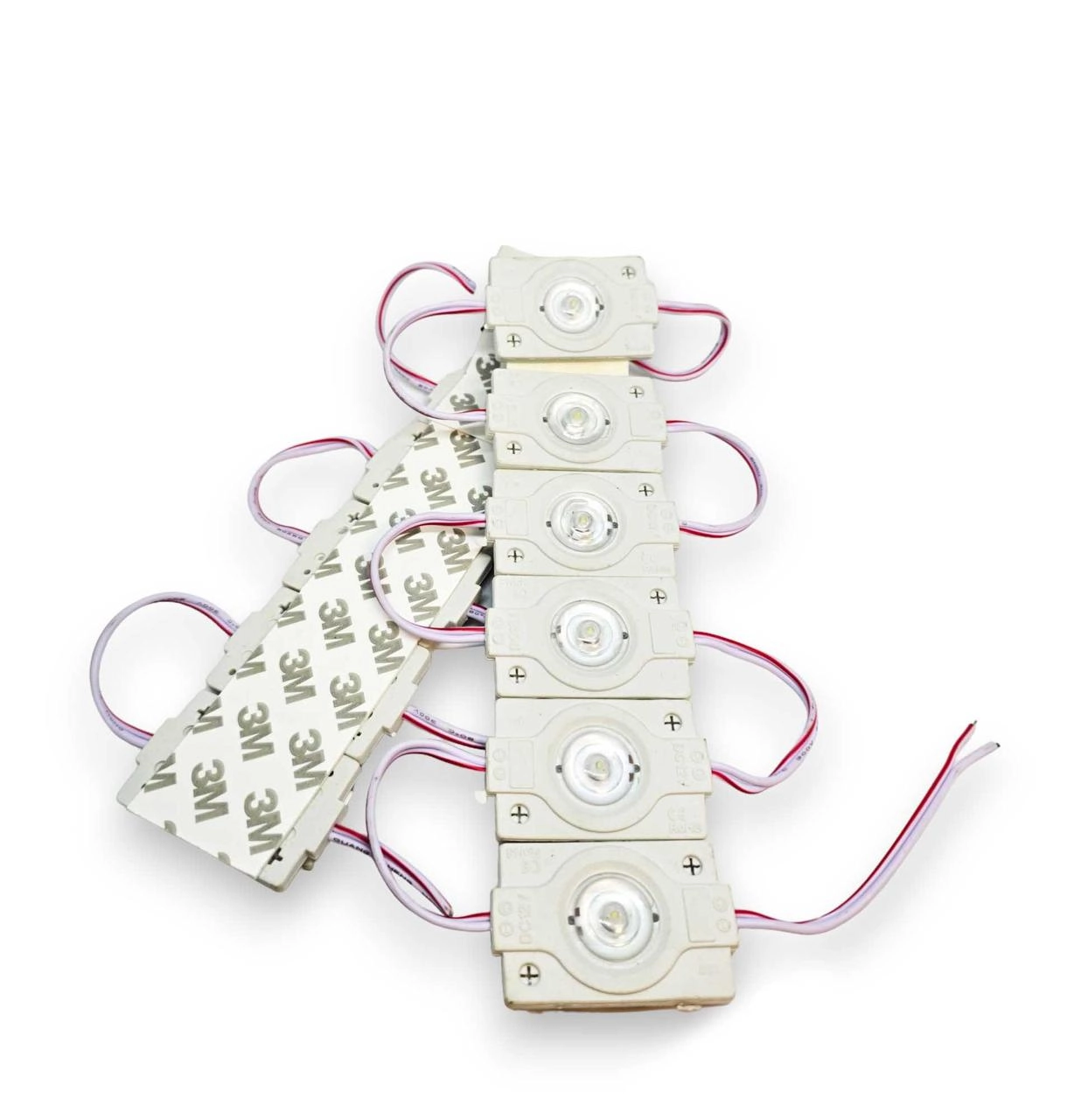 Світлодіодний модуль — це пластикова плата, зі встановленим на ній діодом. Характеристики: Колір світіння: білий Кількість діодів: 1 Напруга: 12V Світловий потік: 170Lm Потужність: 1,5W Розміри: 46х30 Призначення: універсальне (підсвітка номера, дверей, салону та інше)