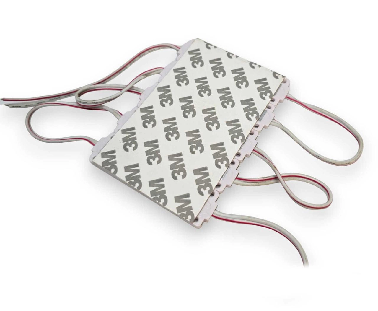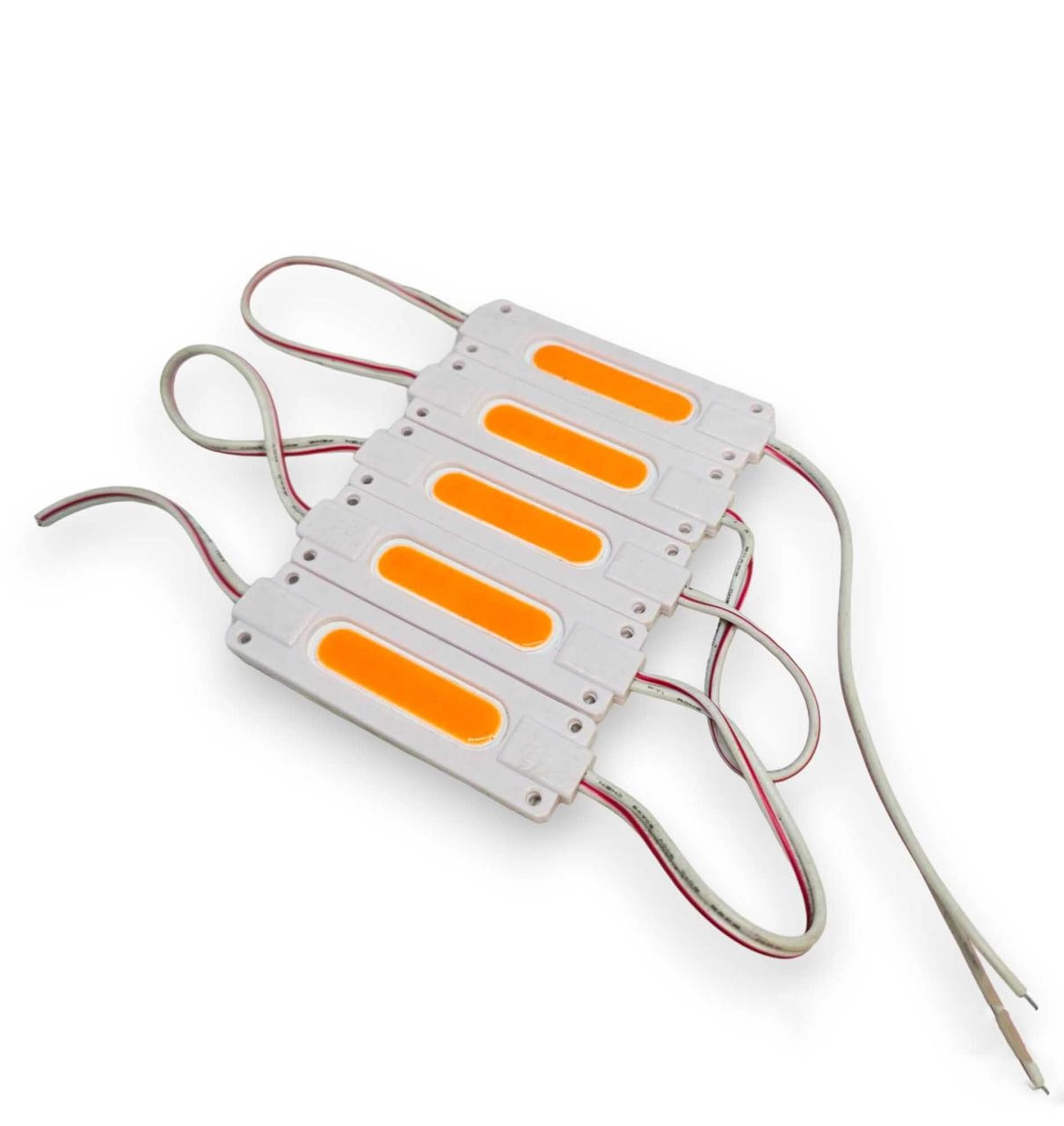 Світлодіодний модуль COB — це пластикова плата, зі встановленим на ній COB-діодом, яка монтується за допомогою двостороннього скотчу або індивідуального кріплення. Світлодіодна плата та контактні дроти надійно загерметизовані в корпусі модуля. Характеристики: Колір світіння: червоний Тип светрдиода: COB Потужність: 3Вт Напруга: 24V Ступінь захисту: Ip67 Світловий потік: 200Lm Кут розсіювання: 120° Розміри: 70 мм × 19 мм × 3 мм Світлодіодний модуль використовується для: – автотюнінгу; – створення зовнішньої реклами; – підсвічування фасадів меблів та інших предметів інтер’єру; – промислового освітлення. Основною його перевагою є економія електроенергії завдяки невеликій споживаній потужності. А доступна вартість і простота монтажу забезпечує широкий спектр застосування. Завдяки надійній герметичності його можна використовувати в приміщеннях із високою вологістю. Модулі між собою зібрані послідовно в єдину герлянду на дротах, що дає змогу підсвічувати конструкцію будь-якого розміру.