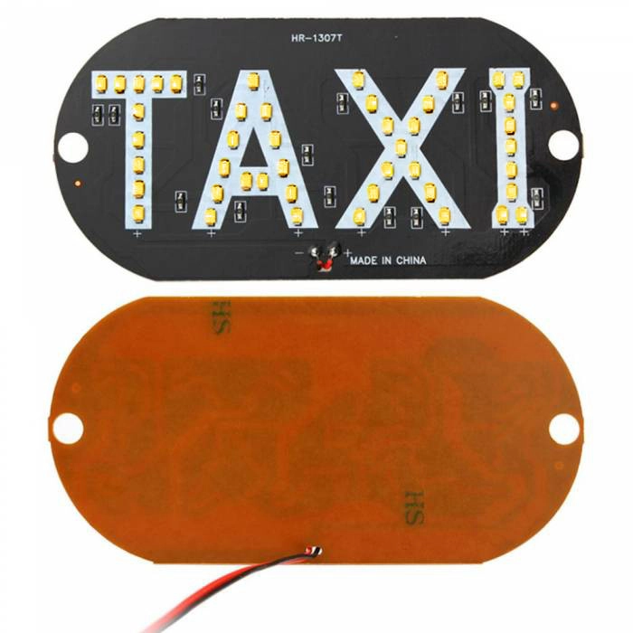 Табличка служить для позначення автомобіля таксі. Особливо корисною буде в темний час доби, так як напис “TAXI” буде помітна здалеку. Табличка являє собою друковану плату з розміщеними на ній SMD компонентами: резисторами і світлодіодами. В якості джерел світла використовуються світлодіоди зеленого кольору світіння в корпусі SMD. З допомогою присосок табличка кріпиться до лобового скла автомобіля всередині салону. Характеристика: Колір світіння: Жовтий Робоча напруга: 12 В; Кількість світлодіодів: 45 шт; Габарити таблички: 140 х 71 х 2,1 мм;