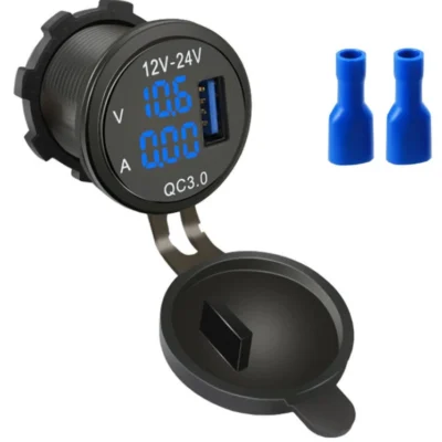 Автомобільний зарядний пристрій один порт USB 12-24V врізна розетка, Вольтметр + амперметр сине підсвічування